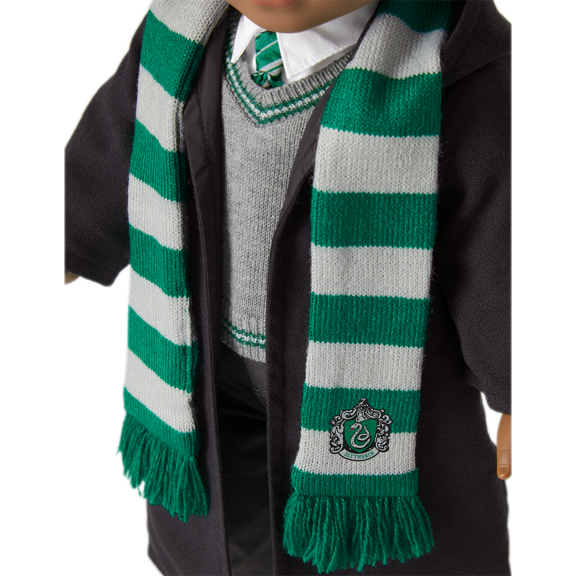 American Girl Slytherin Set for 18-inch Dolls: A gray sweater with green and silver stripes on the trim and a Slytherin crest on the chest, a green and silver satin tie, and a green and silver knit scarf featuring the Slytherin crest and fringe on the ends