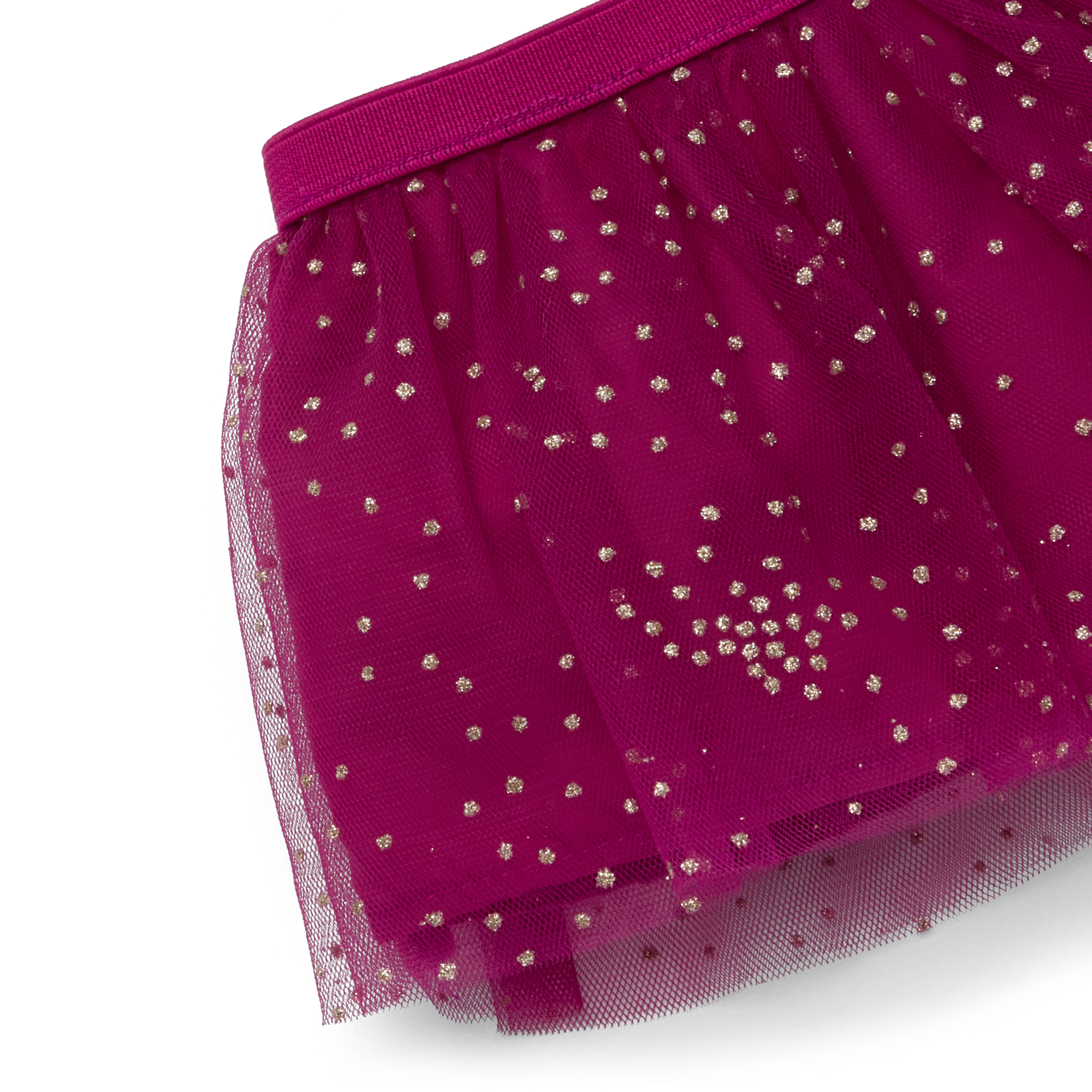 American Girl x Janie and Jack Twinkling Tulle Skirt for 18-inch Dolls: A magenta tulle skirt with gold glitter print and an elastic waistband, plus an American Girl x Janie and Jack hanger