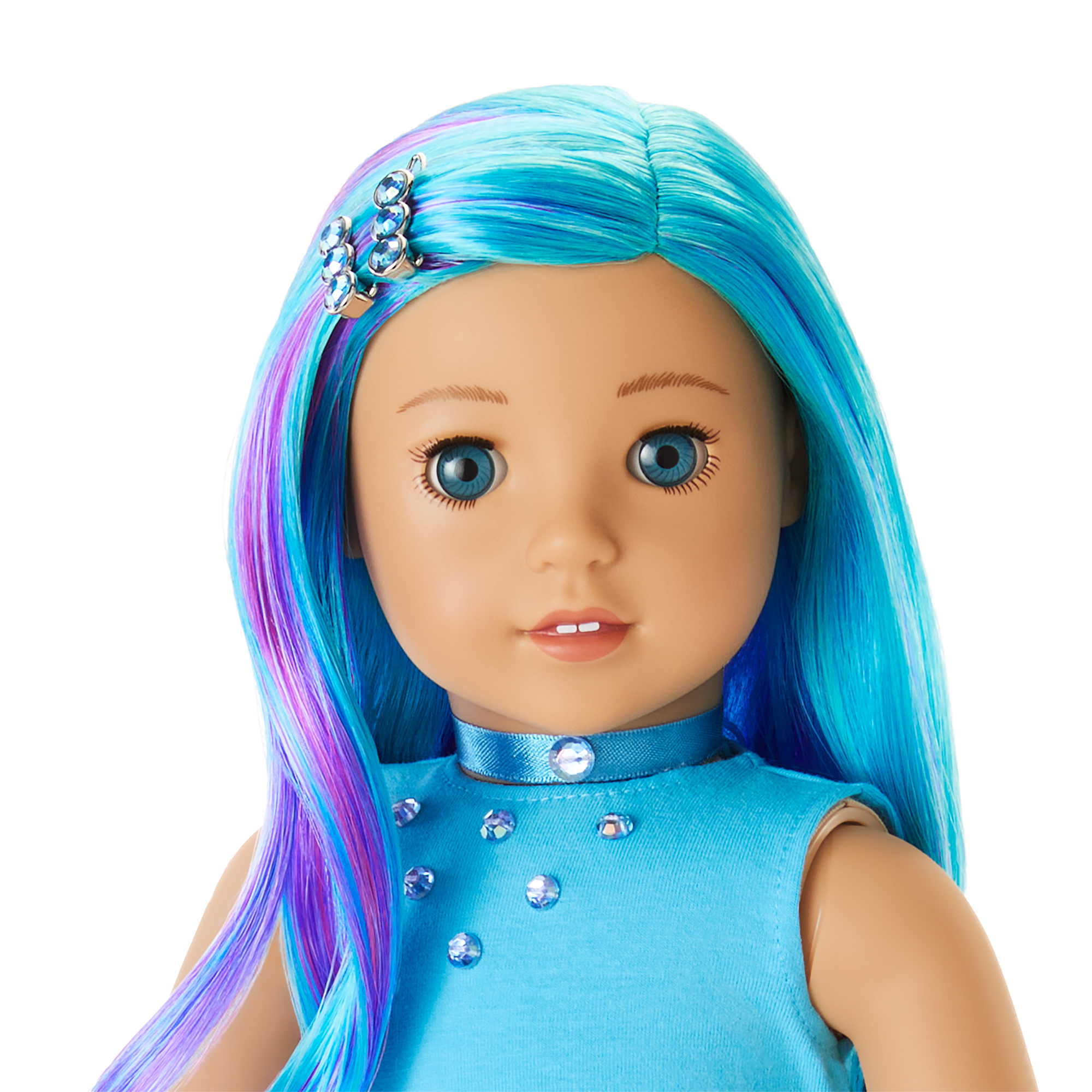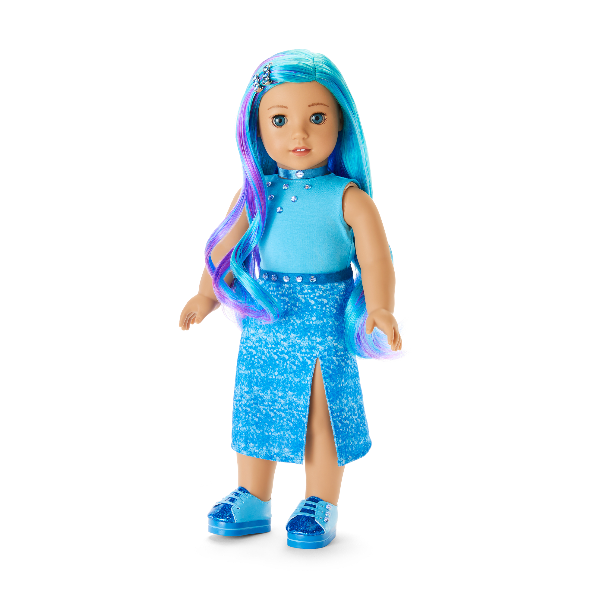 A pair of barrettes with three gems on each and a pair of blue platform low-top sneakers with gems, striped soles, and glittery toes