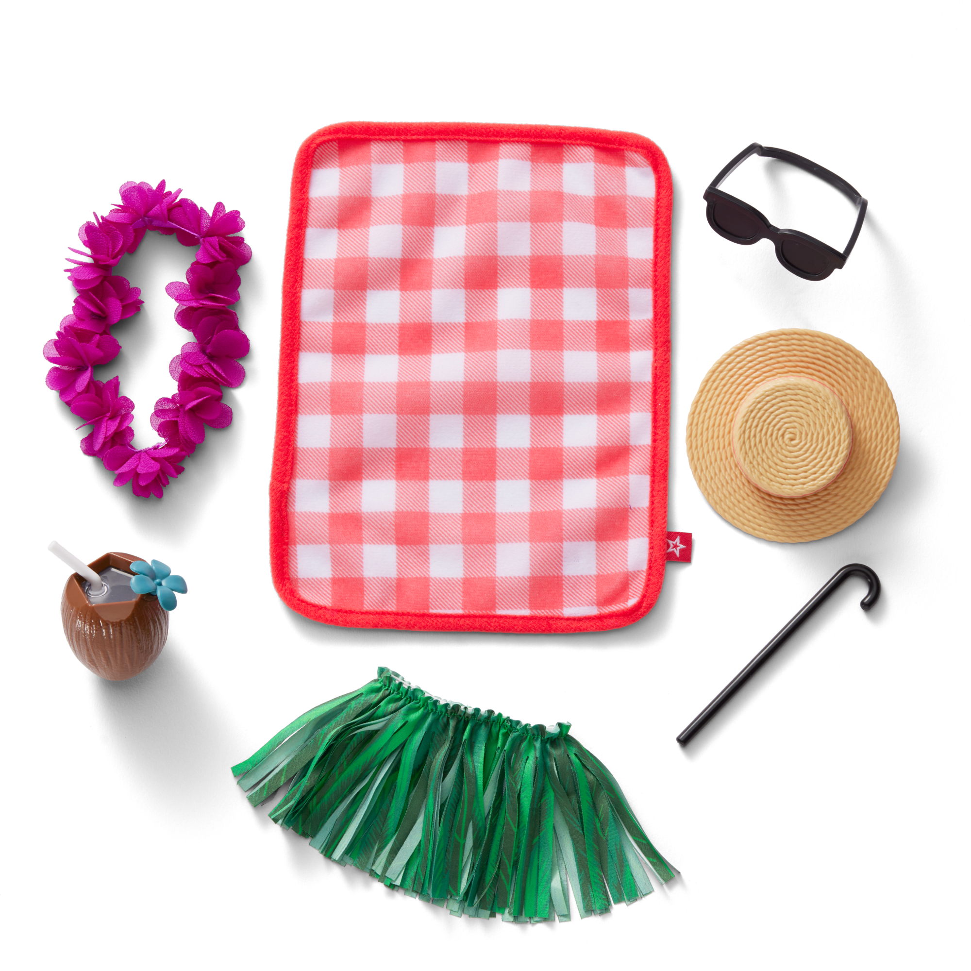 A purple flower lei, a faux coconut drink cup with attached flower and straw, a green grass skirt, and a pair of black sunglasses