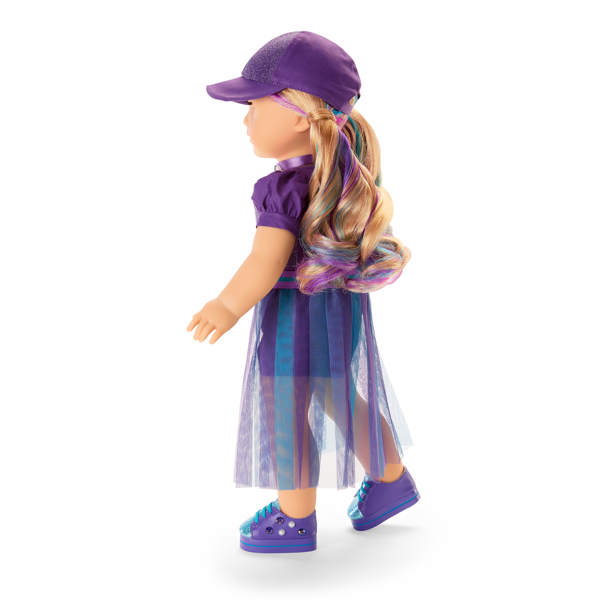 A purple glitter-knit cap with a sparkly inset design and a pair of purple sneakers with glittery toes, blue laces, and striped soles