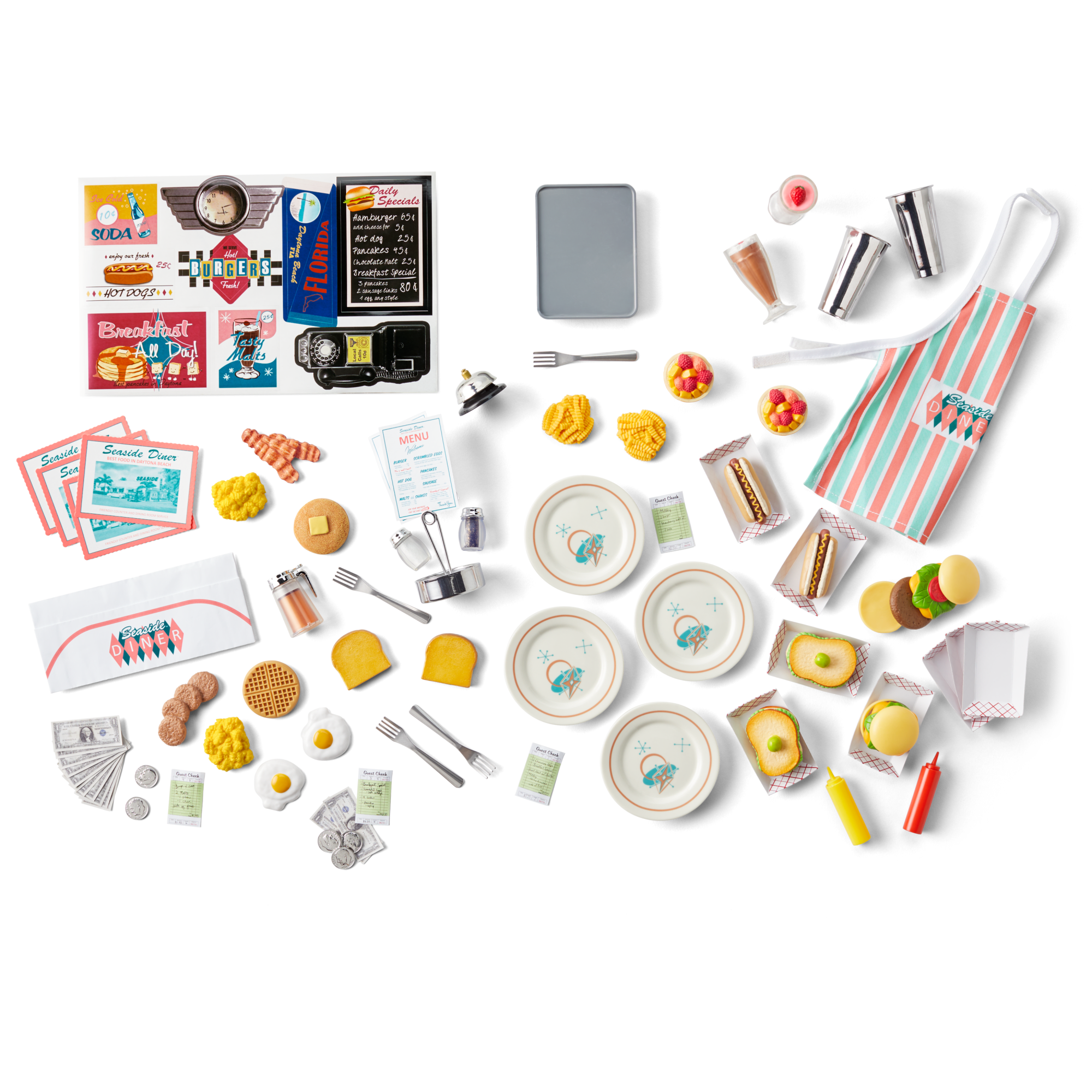 Behind-the-scenes necessities: Four order slips to hang above the counter for the chef; a metal bell to ring when an order is up; a doll-sized fabric apron and paper hat printed with the diner’s name for cooks to wear behind the line; a serving tray dolls can carry and eight paper trays to hold food; four metal forks; and salt and pepper shakers.