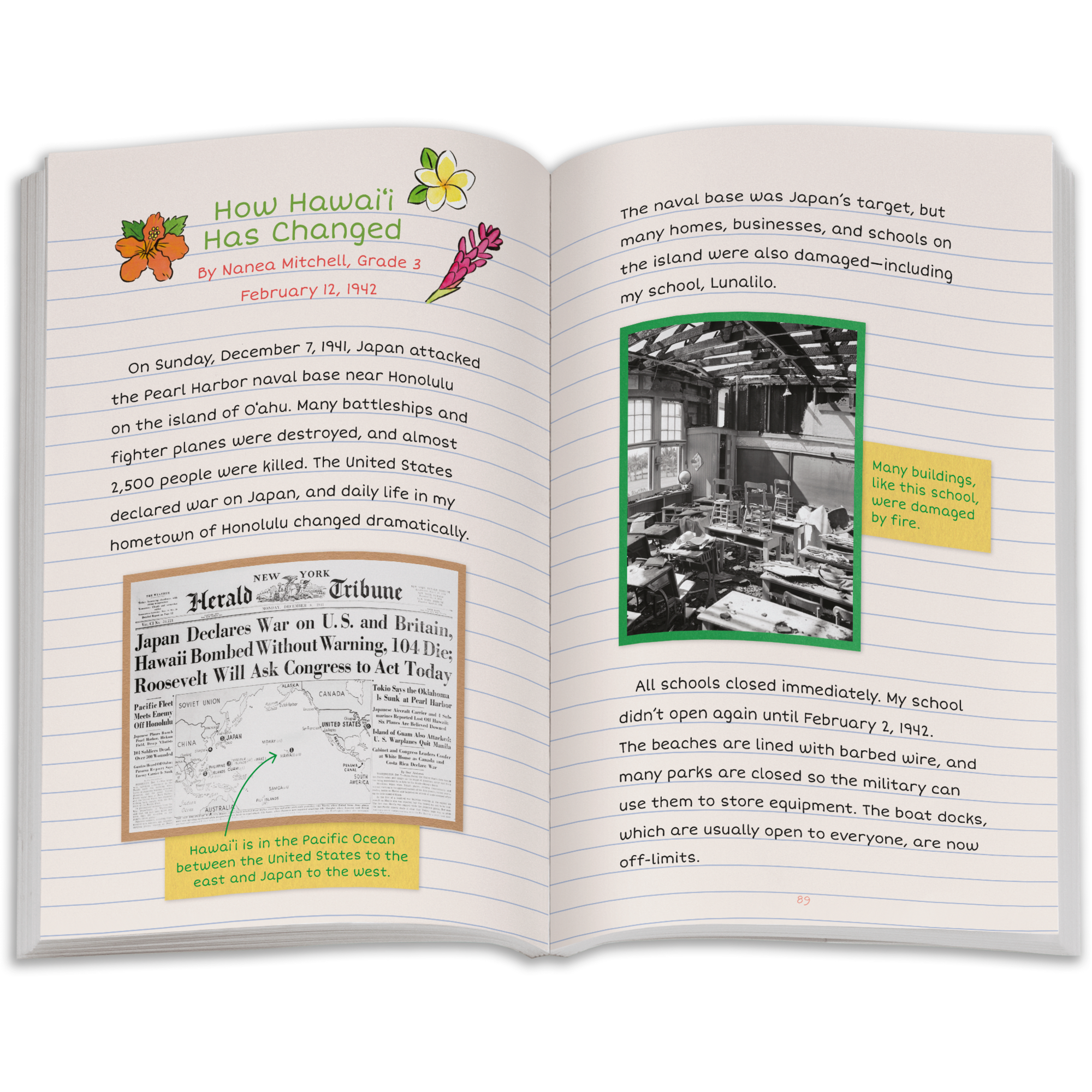 The 18″ Nanea doll has a soft cotton body, and her movable head and limbs are made of smooth vinyl. Includes the Nanea: My Diary paperback book, told from Nanea’s perspective and describing her life in Honolulu before and after the attack on Pearl Harbor.
