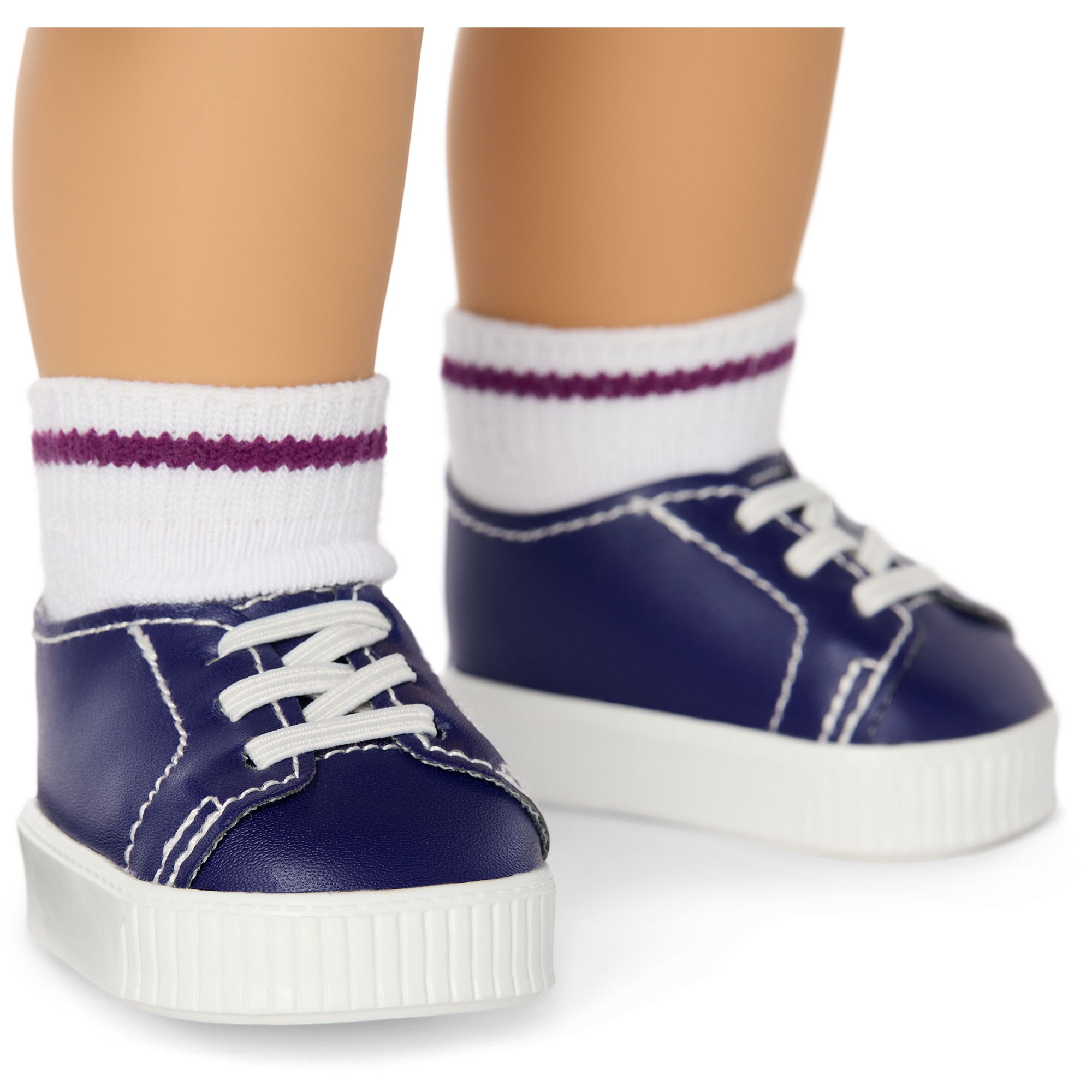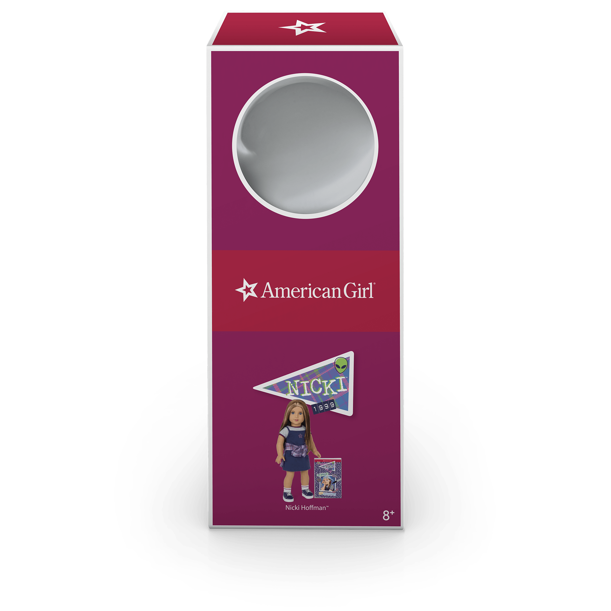An 18” Nicki doll with blue eyes that open and close, and long brown hair with face-framing layers and front blonde highlights. She has a soft cotton body, and her movable head and limbs are made of smooth vinyl.