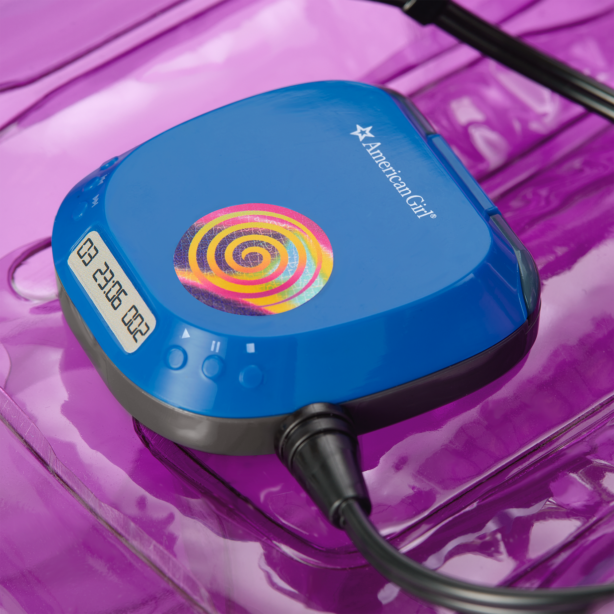 A pretend personal CD player that opens and closes, two pretend CDs that fit inside, two CD cases, and headphones that attach to the CD player that Nicki can wear