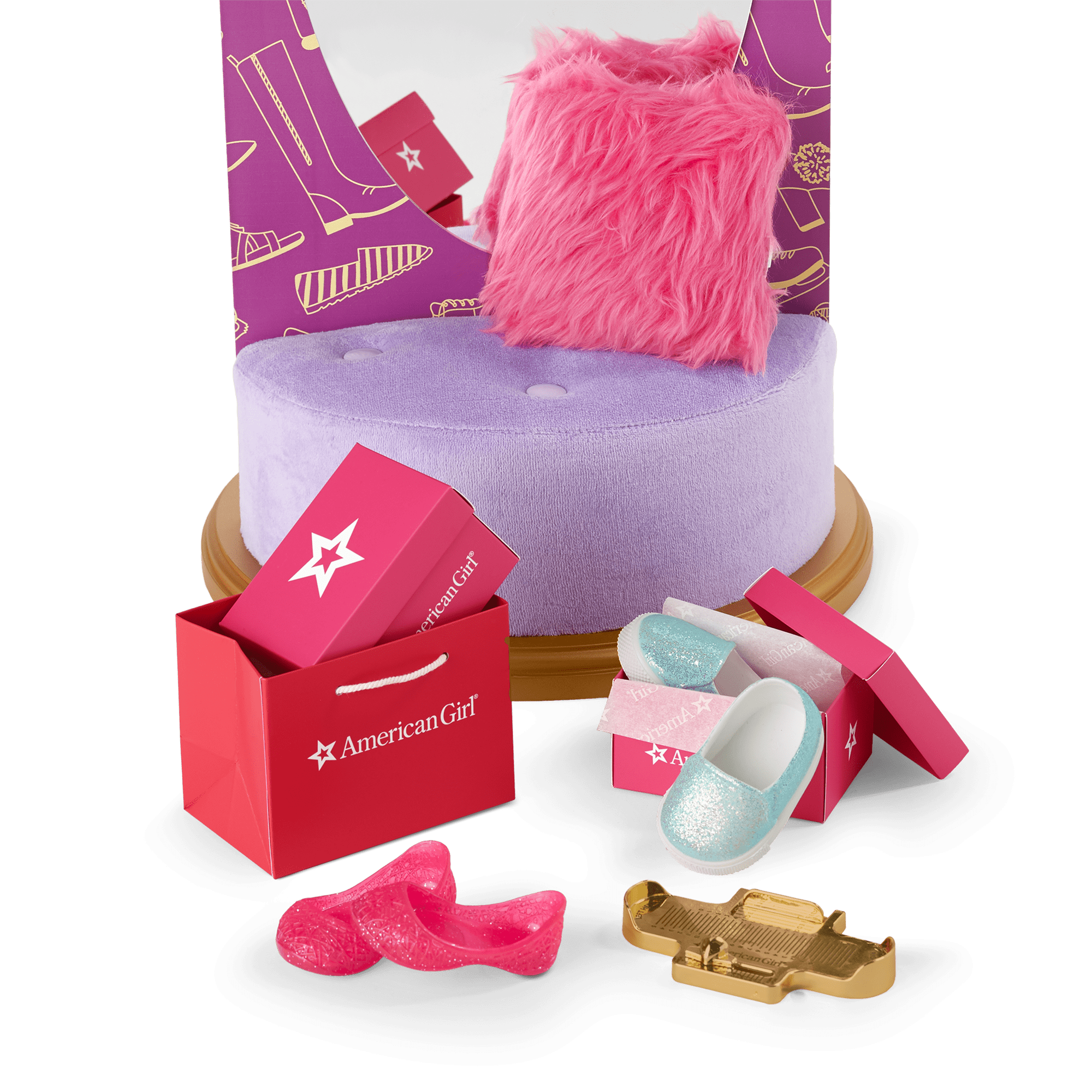 A miniature American Girl shopping bag that fits both shoe boxes