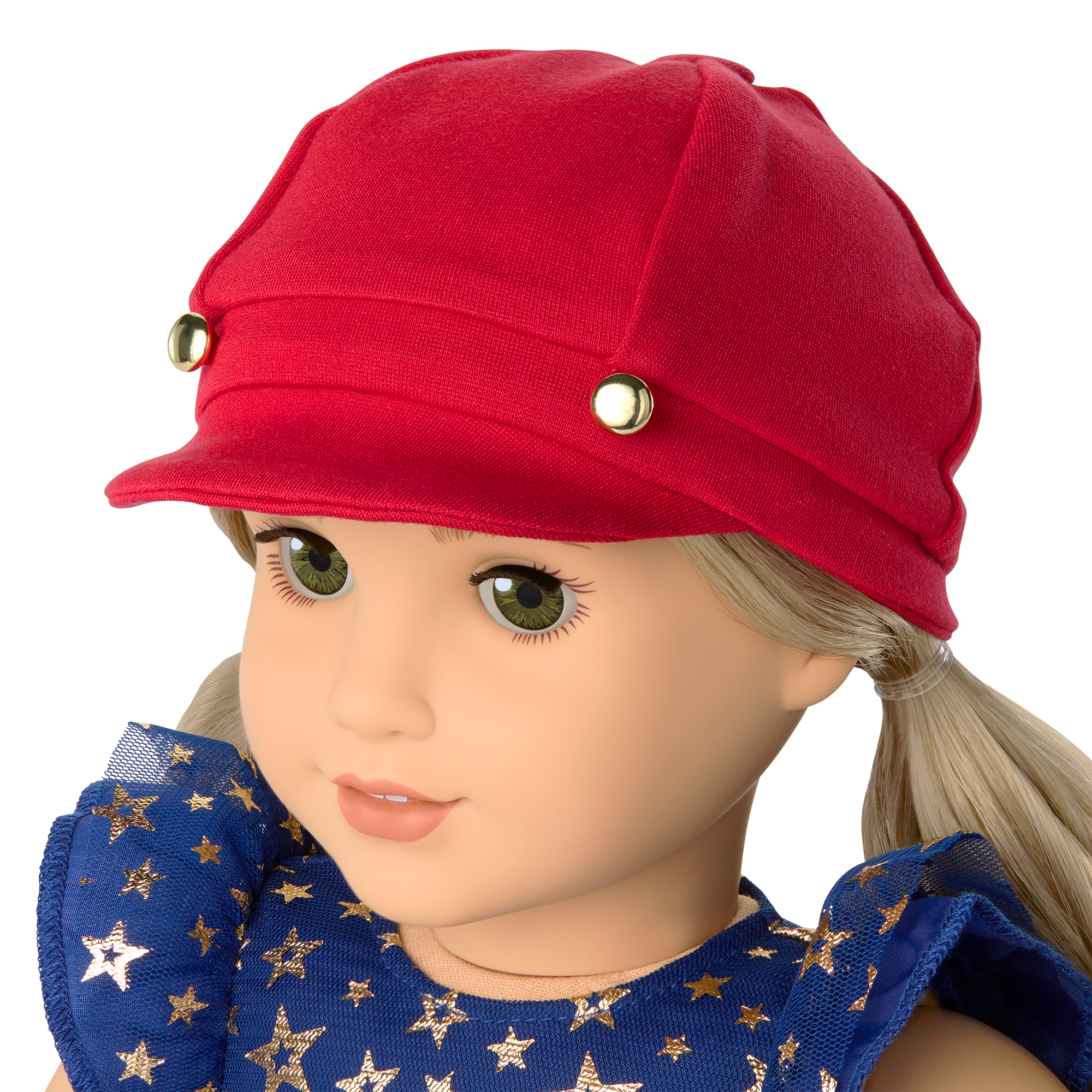 A red knit newsboy hat with two golden button accents on the front
