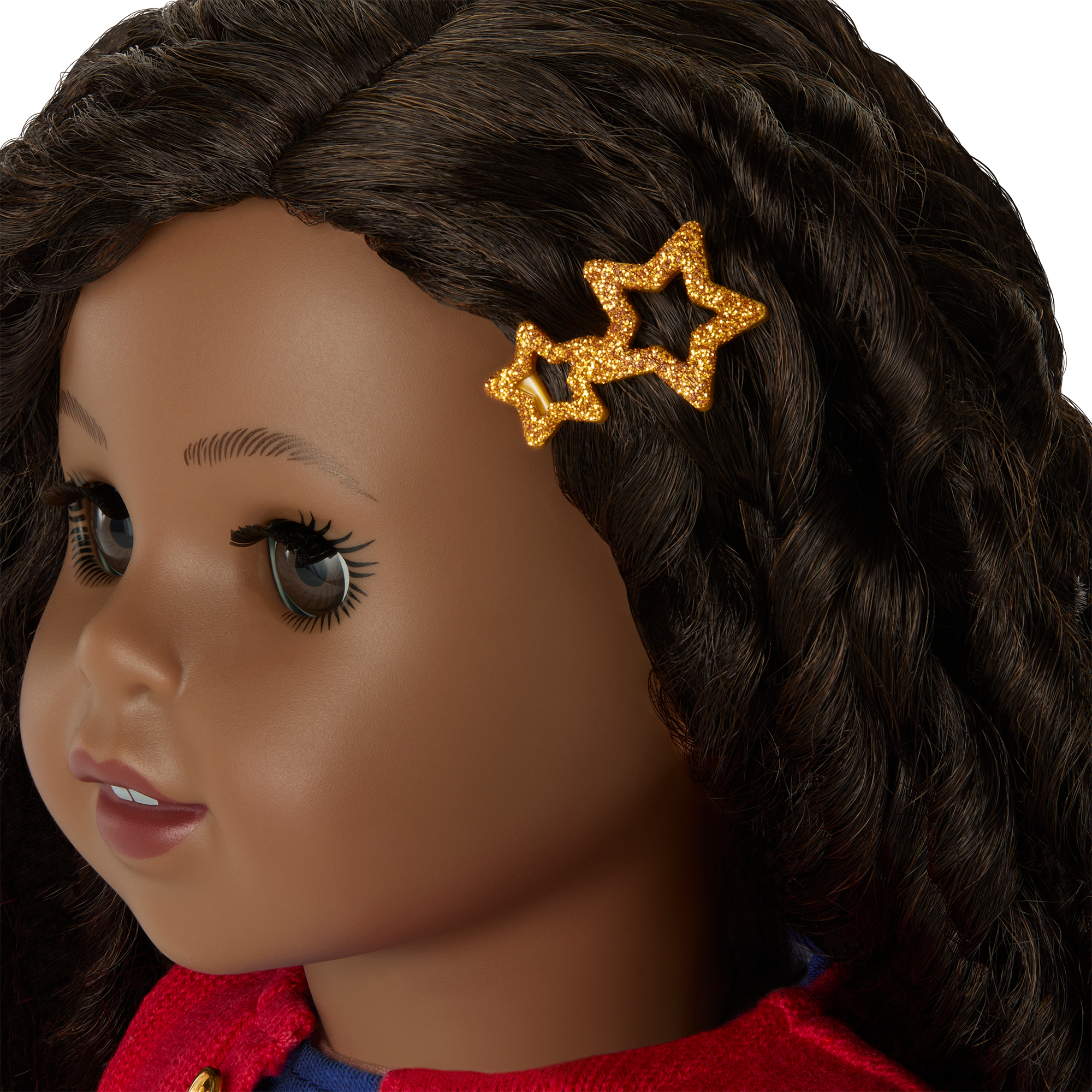 A glittery golden star hair clip, a pair of blue ankle socks, and a pair of low-top white sneakers with red accents at the sides