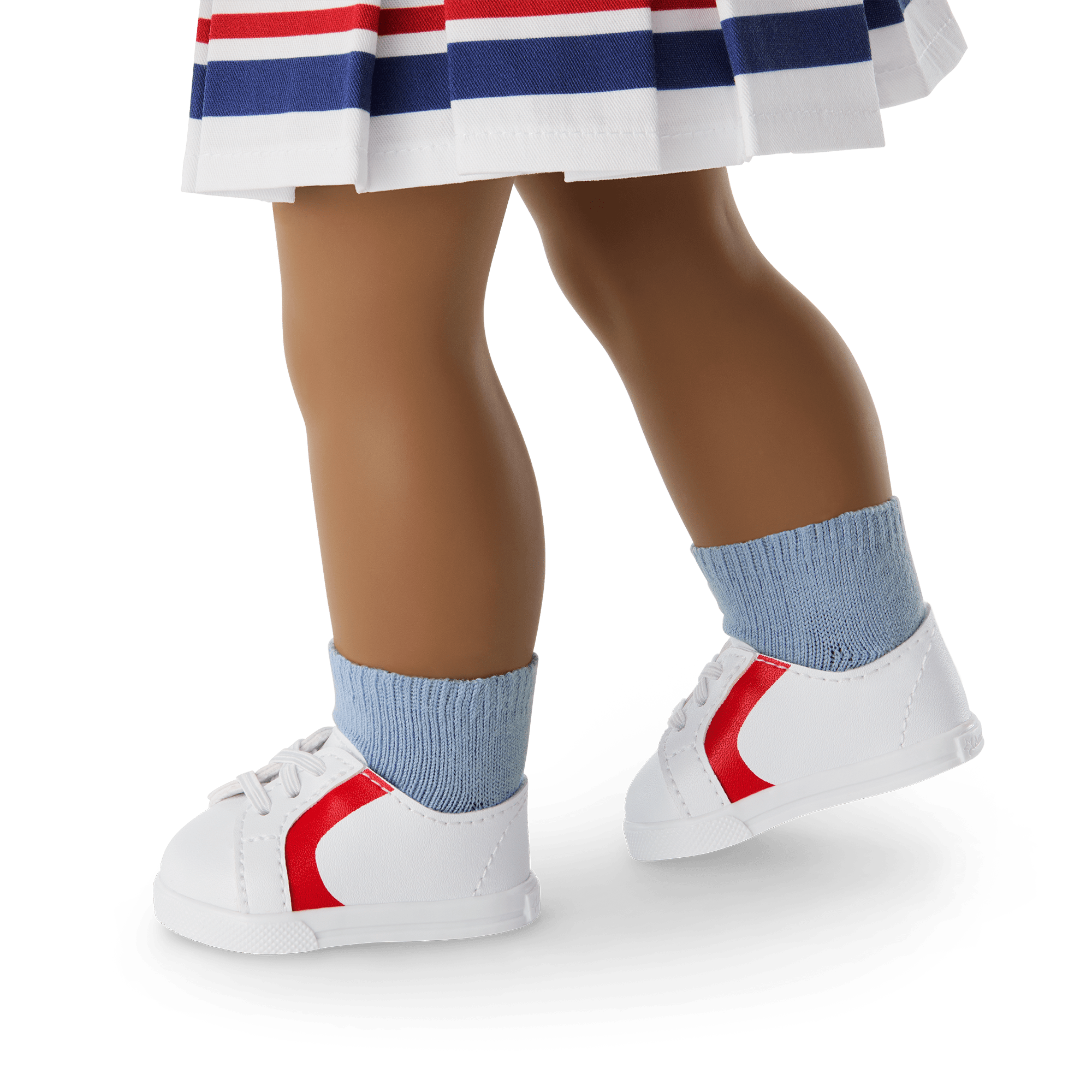 A white cotton-twill tennis skirt with red and blue stripes at the hem