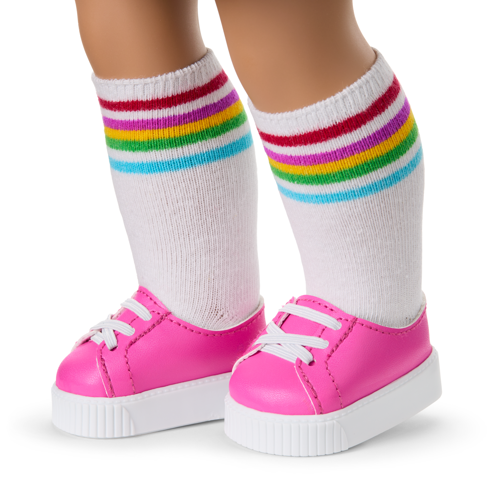 A white tee with a multicolored star print, a pair of pink underwear, a faux-denim skirt, a pair of white knee-high socks with multicolored stripes, and a pair of pink sneakers
