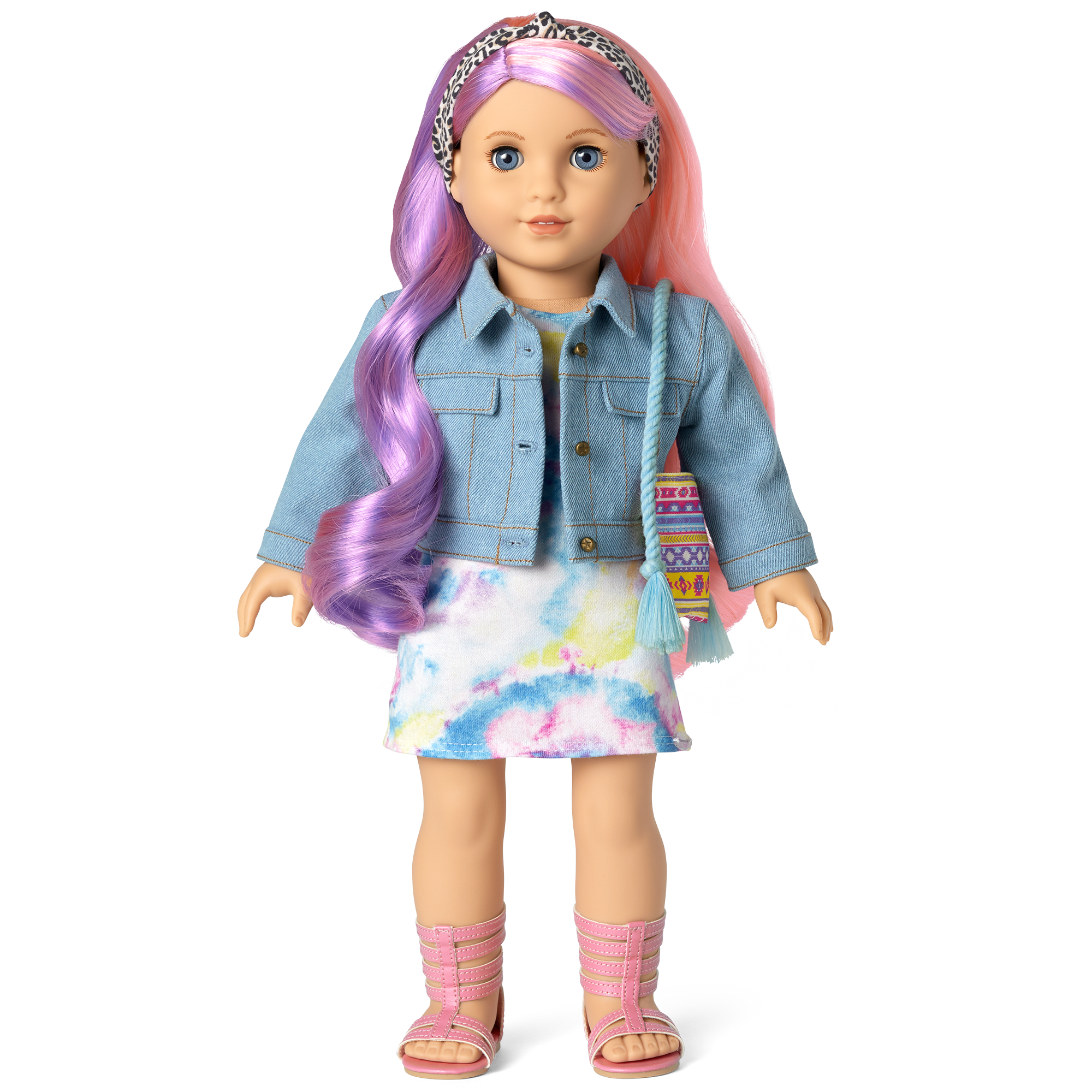 Show Your Artsy Side Accessories for 18-inch Dolls: A button-front denim jacket, a knotted leopard-print headband, and a colorful printed purse