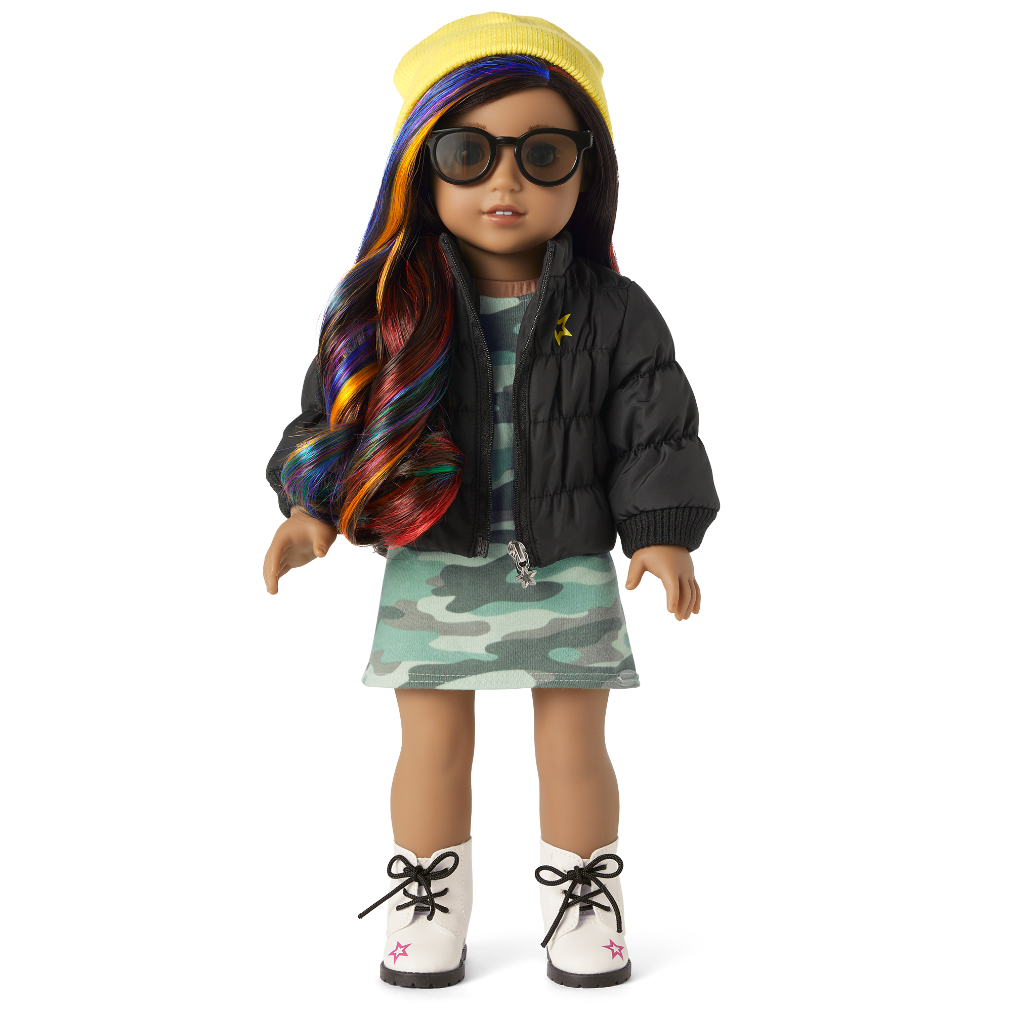Show Your Strong Side Accessories for 18-inch Dolls: A black zip front puffer jacket with an embroidered star, a yellow knit beanie, and a pair of black sunglasses